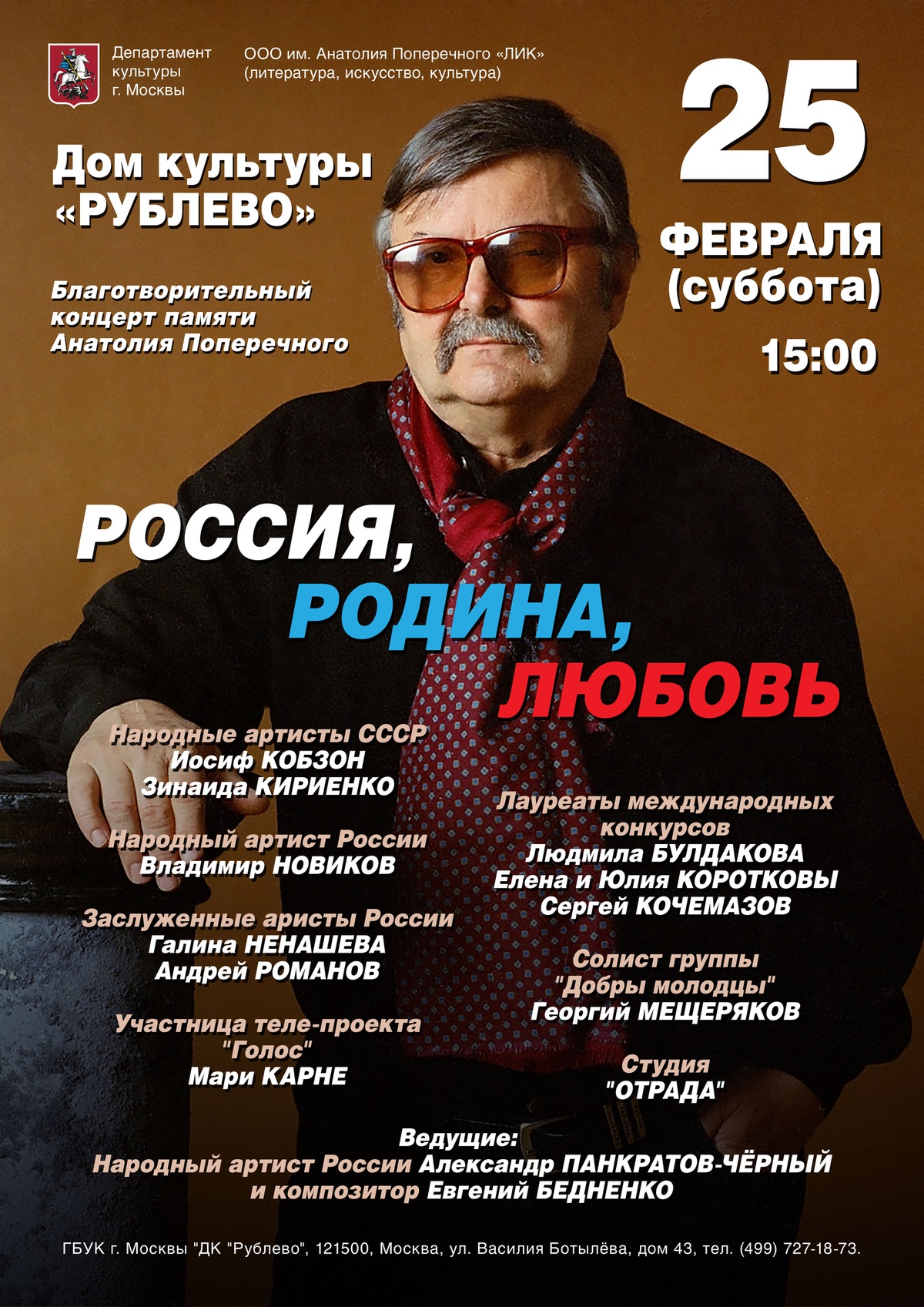 Приглашаем всех желающих на благотворительный концерт памяти поэта Анатолия Поперечного, который пройдет 25 февраля в ДК "Рублево" по адресу: Москва, ул.Василия Ботылева, д.43, тел. +7 (499) 727-18-73. Начало в 15:00. Вход свободный.